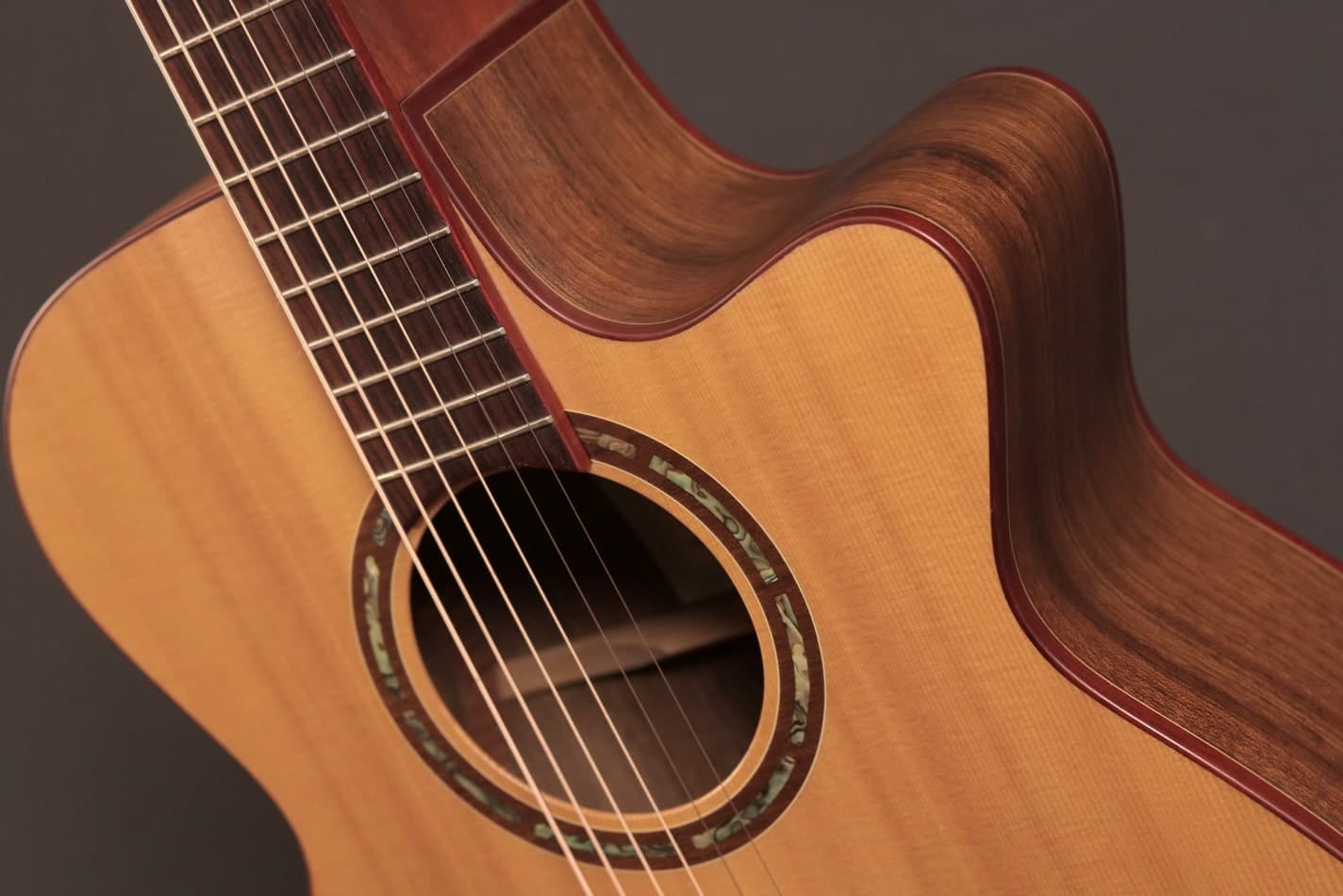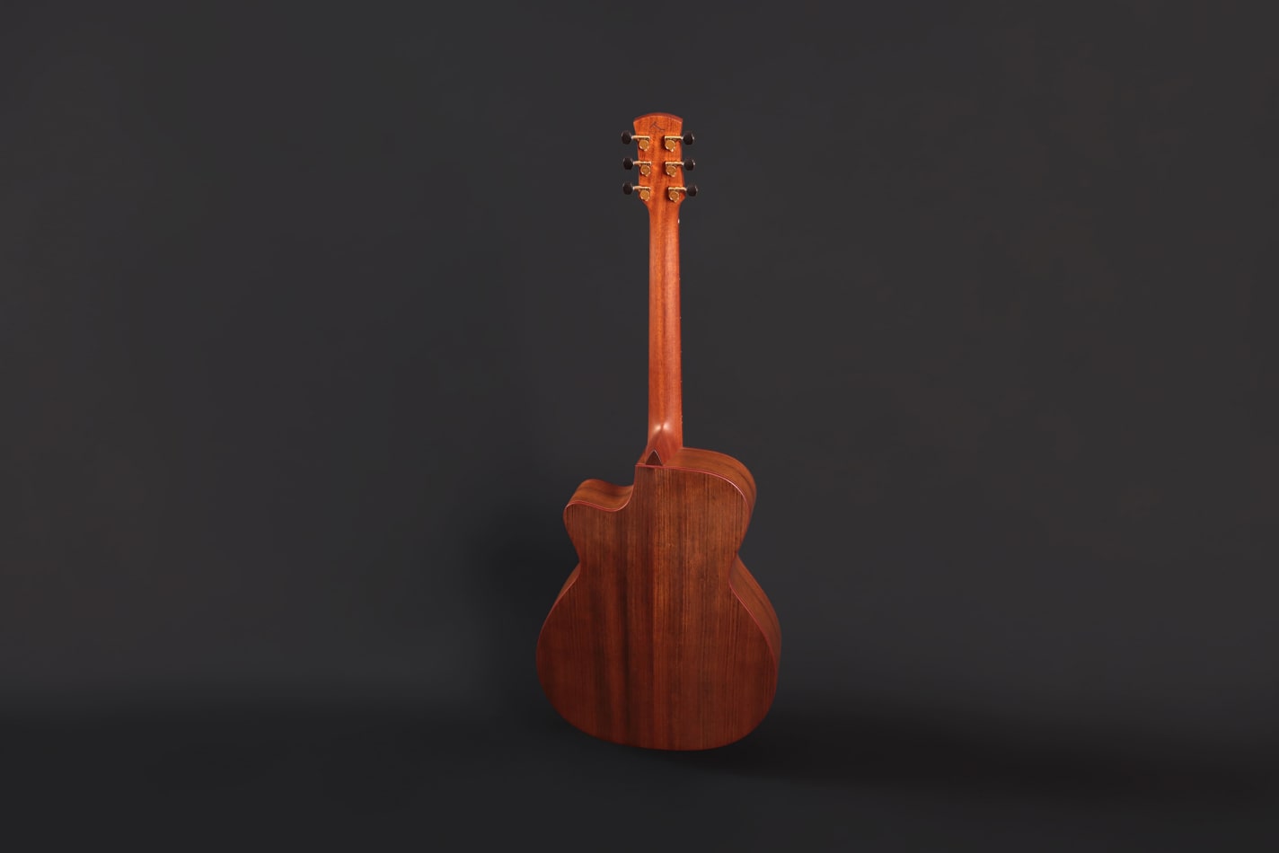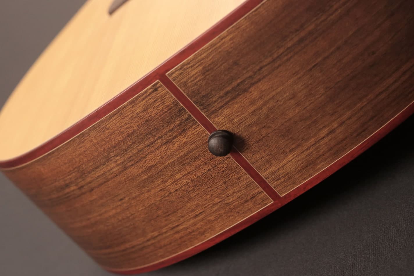 採用西堤卡雲杉面板與非洲胡桃木側背板,搭配花梨木護邊線及口輪圈格狀綠貝鑲嵌,胡桃木紋理流動細膩,展現沉穩自然的質感。 音色溫暖均衡,低頻比桃花心木更為厚實,中頻則帶有玫瑰木的細膩層次,聲音凝聚且回響豐富。