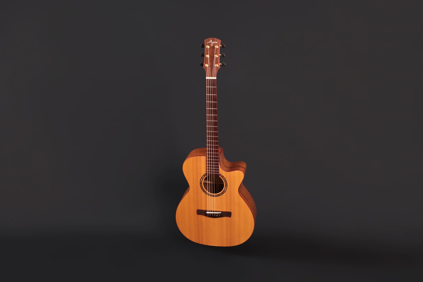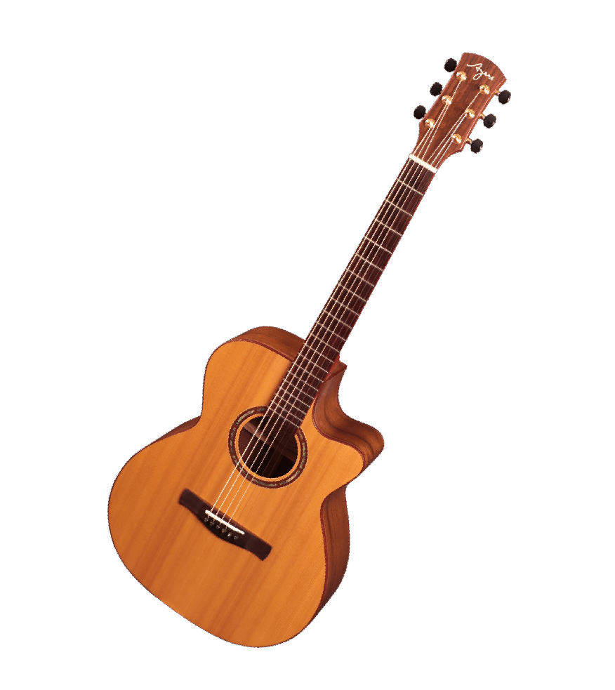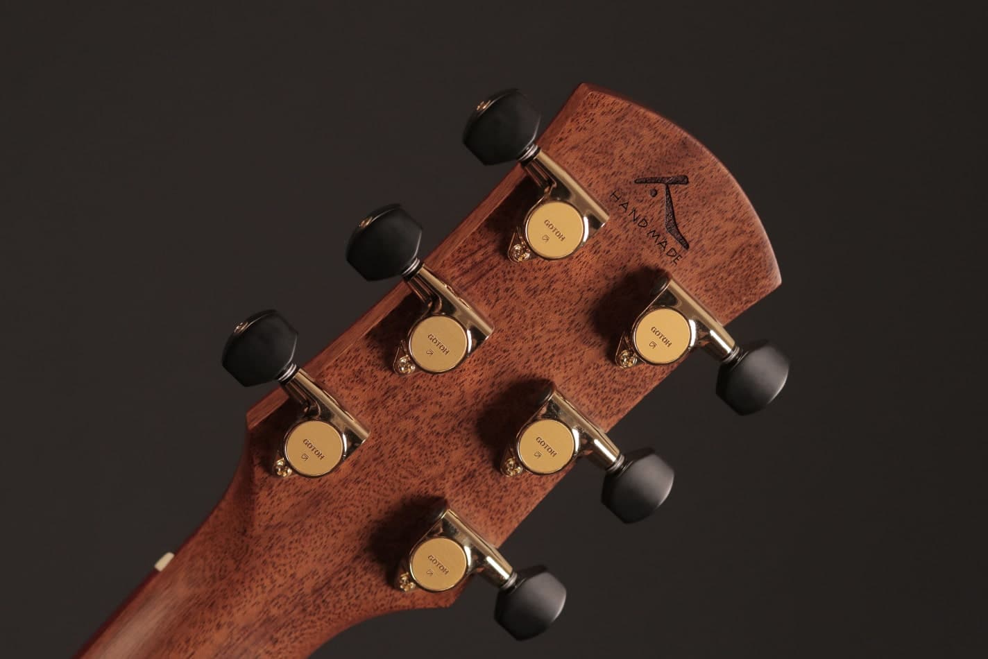 採用西堤卡雲杉面板與非洲胡桃木側背板,搭配花梨木護邊線及口輪圈格狀綠貝鑲嵌,胡桃木紋理流動細膩,展現沉穩自然的質感。 音色溫暖均衡,低頻比桃花心木更為厚實,中頻則帶有玫瑰木的細膩層次,聲音凝聚且回響豐富。