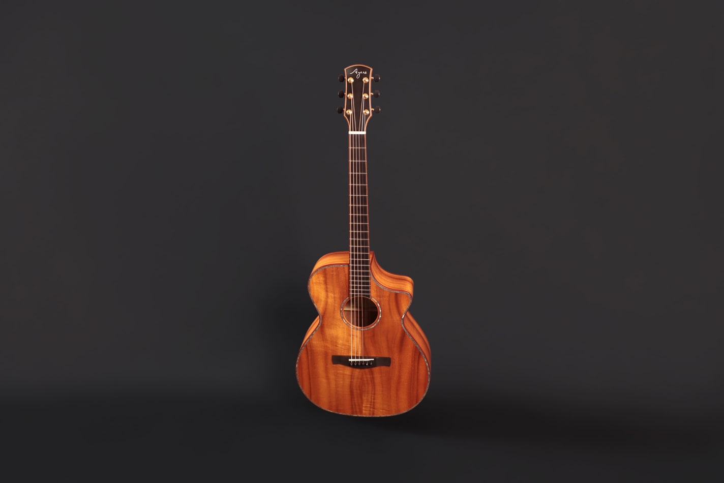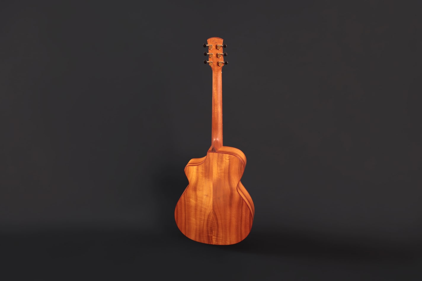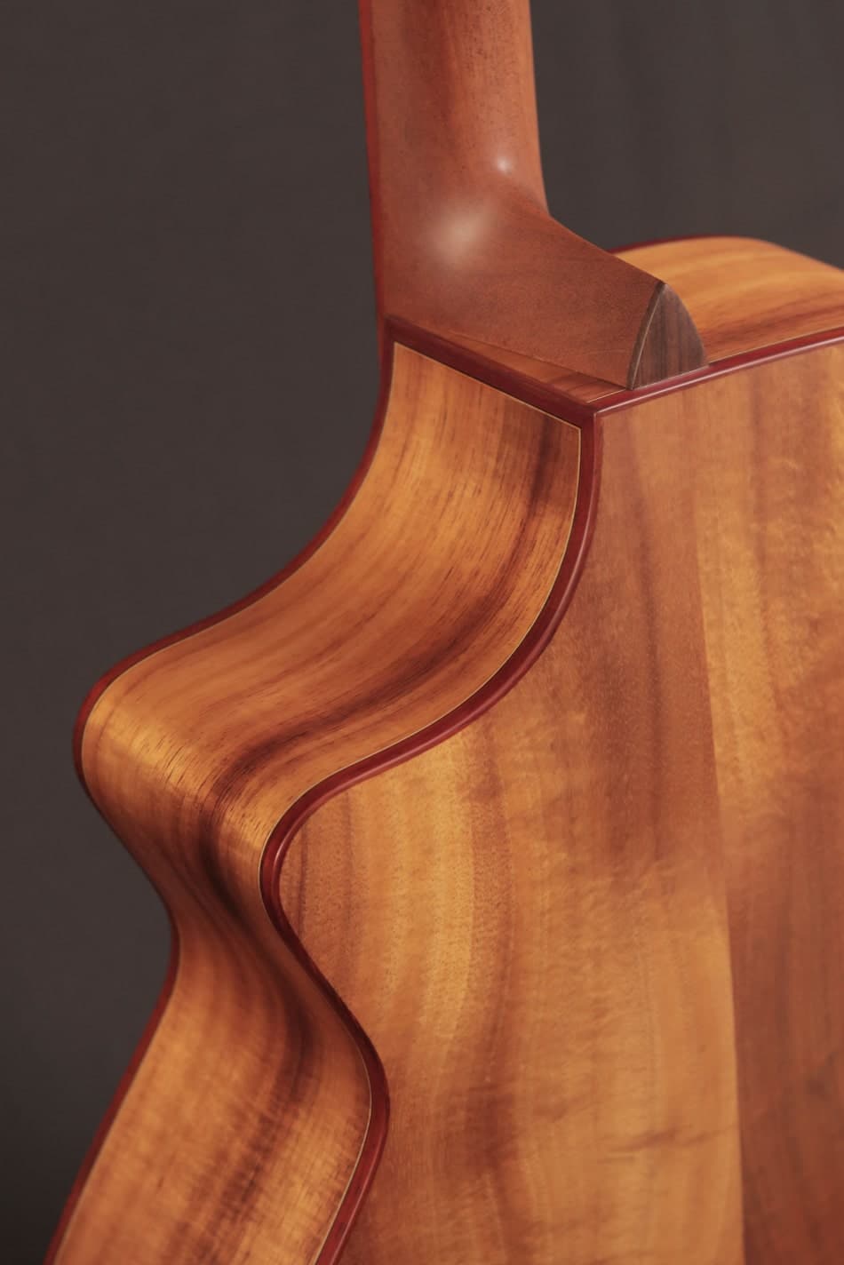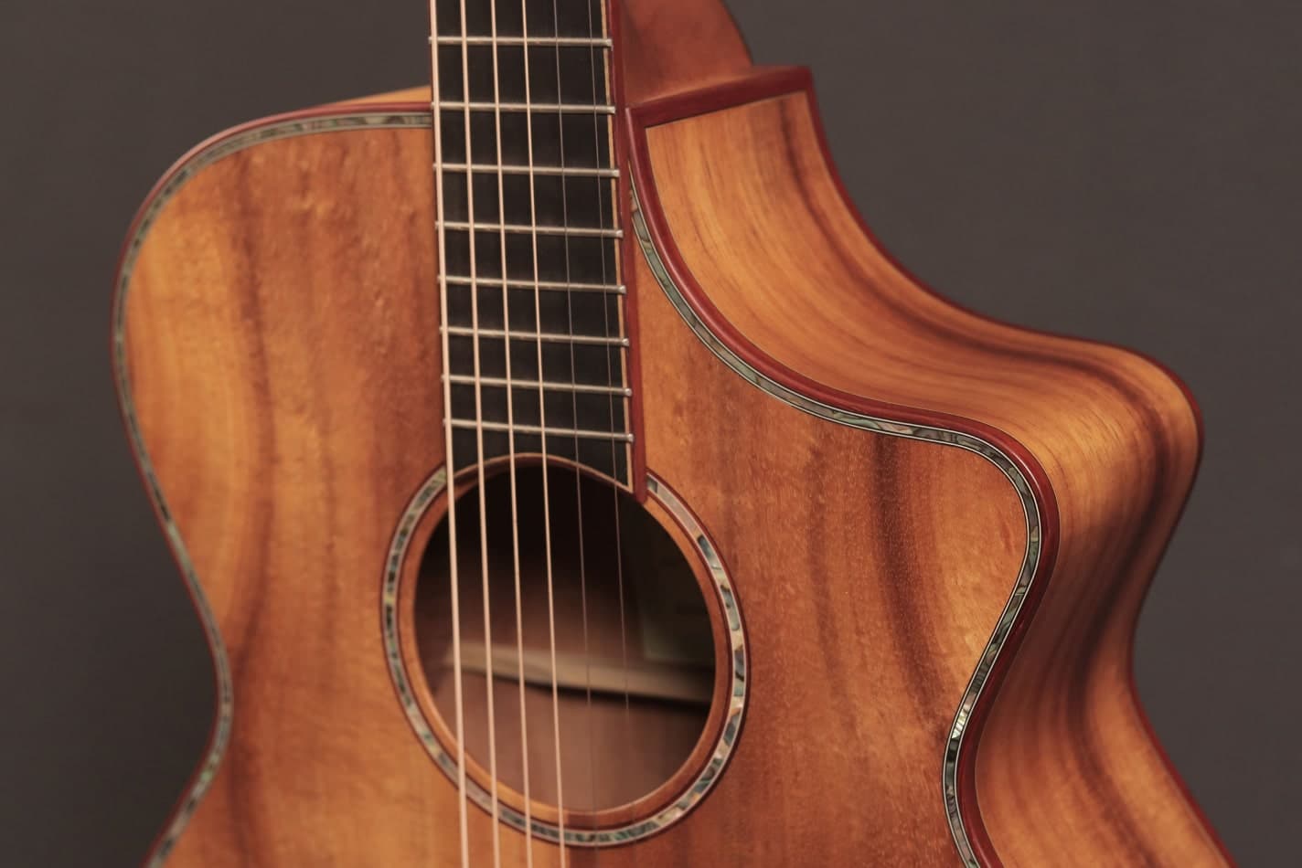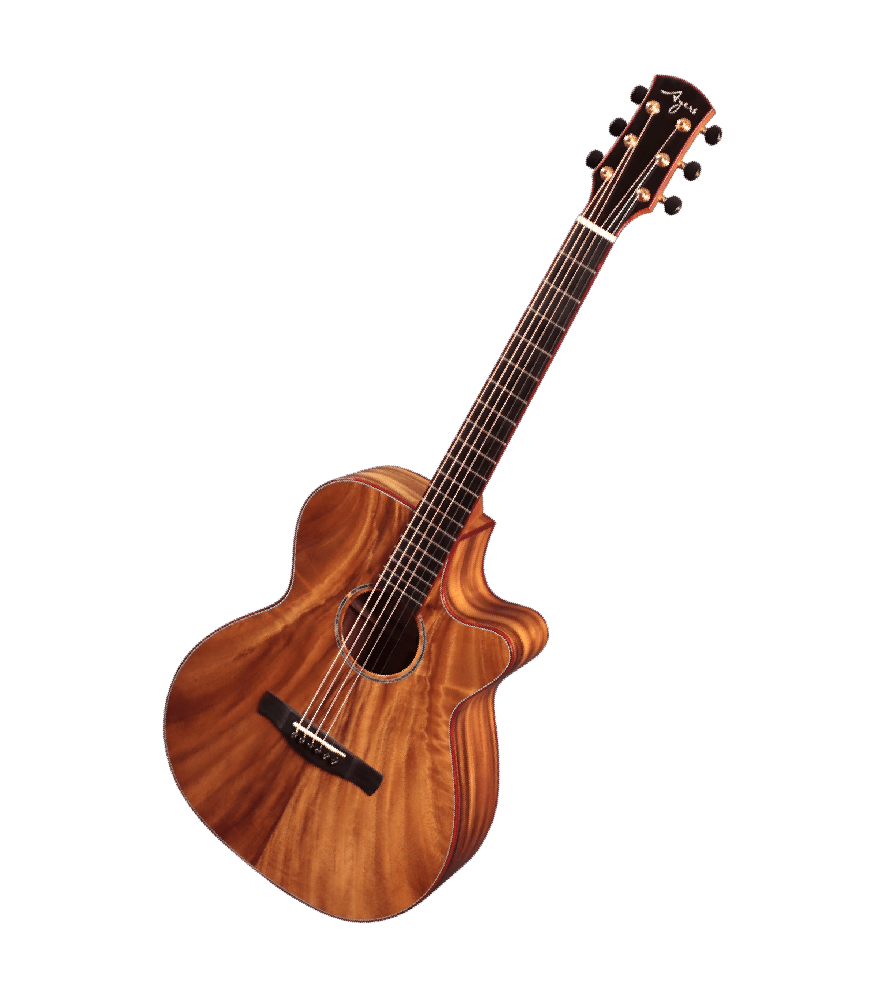 採用 4A 級夏威夷相思木打造面板與側背板,搭配花梨木護邊線及口輪圈綠貝鑲嵌,木紋如火焰般流動,展現鮮明個性。音色溫暖通透,中頻豐富,低頻柔和飽滿,高頻延展自然,隨彈奏時間逐漸開放,泛音靈動且充滿律動感。
