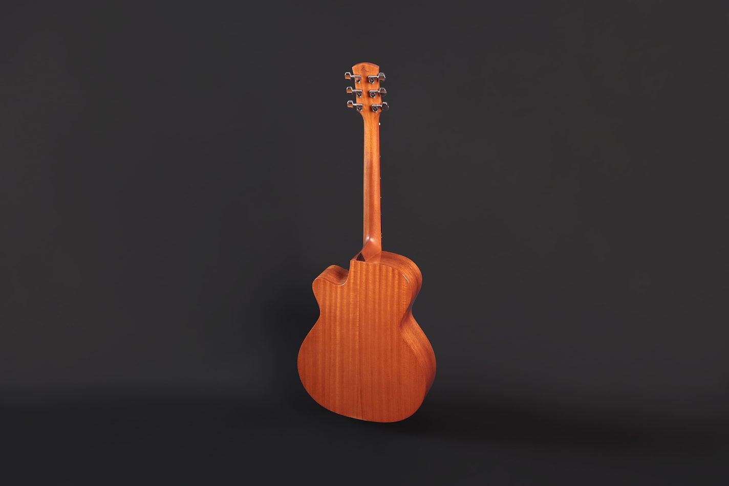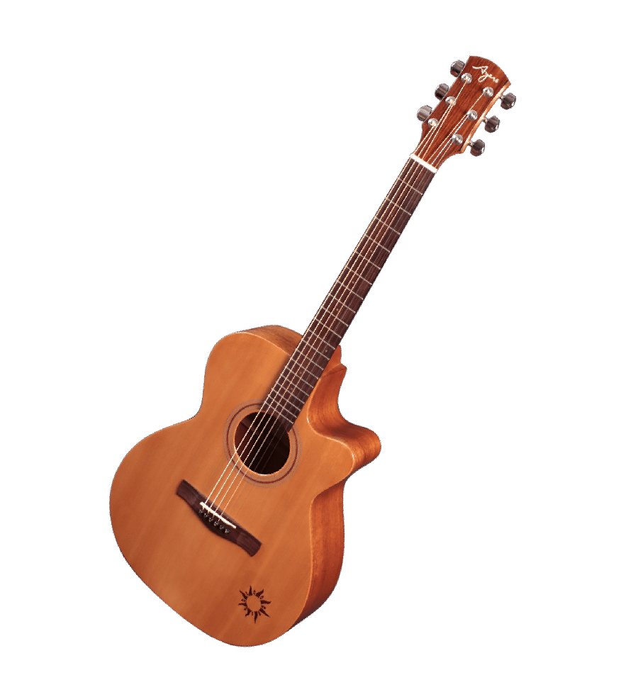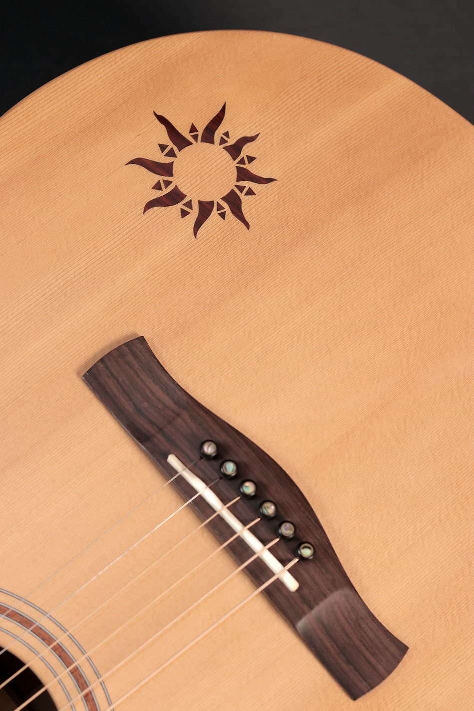 採用西提卡雲杉面板與越南桃花心木側背板,搭配奧昇弦釘,面板鑲嵌木雕小太陽圖騰,溫暖光輝自木紋間綻放,明亮而生動。 音色如暖陽映照大地,低頻穩健、中頻溫暖、高頻透亮,層次分明且充滿朝氣。