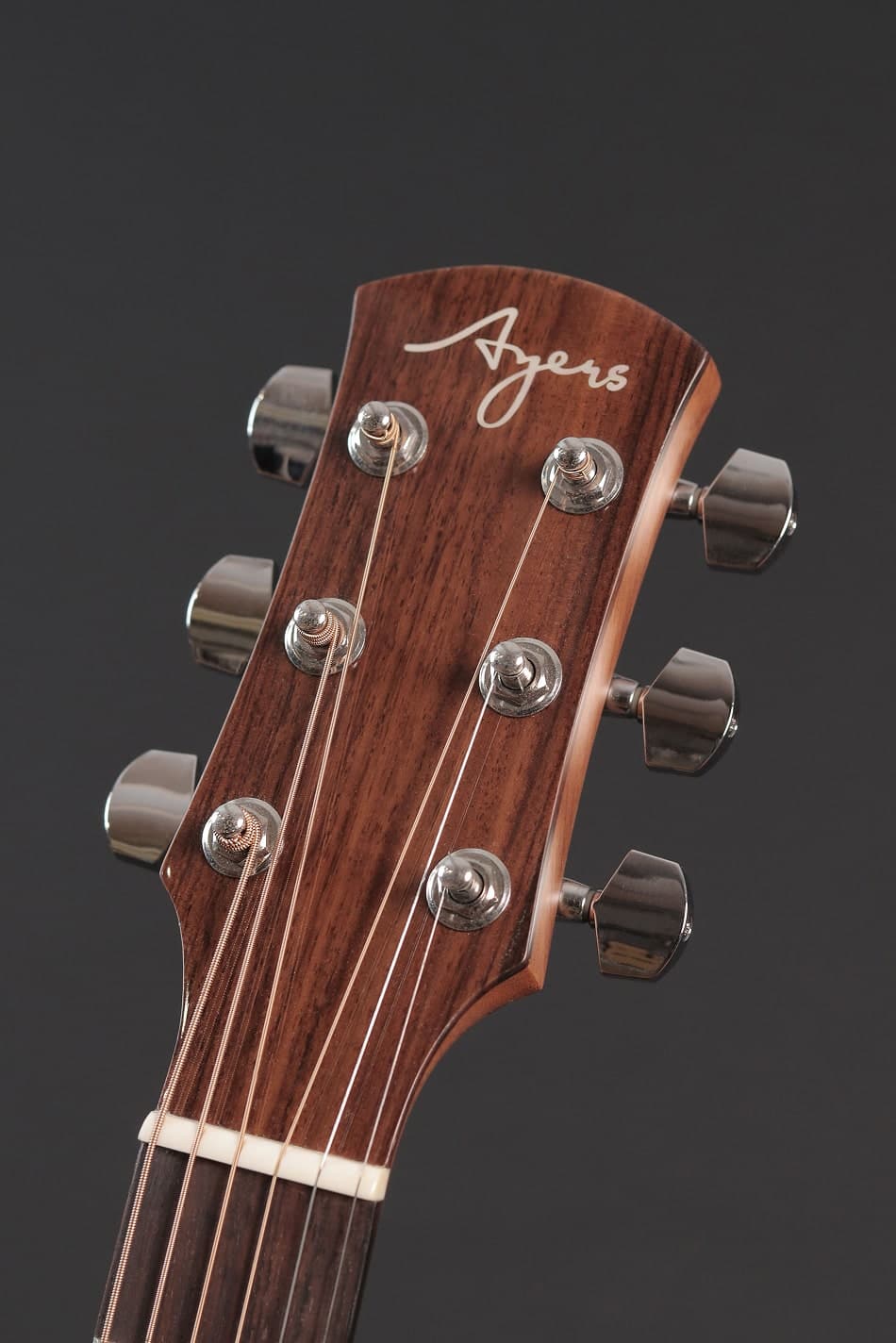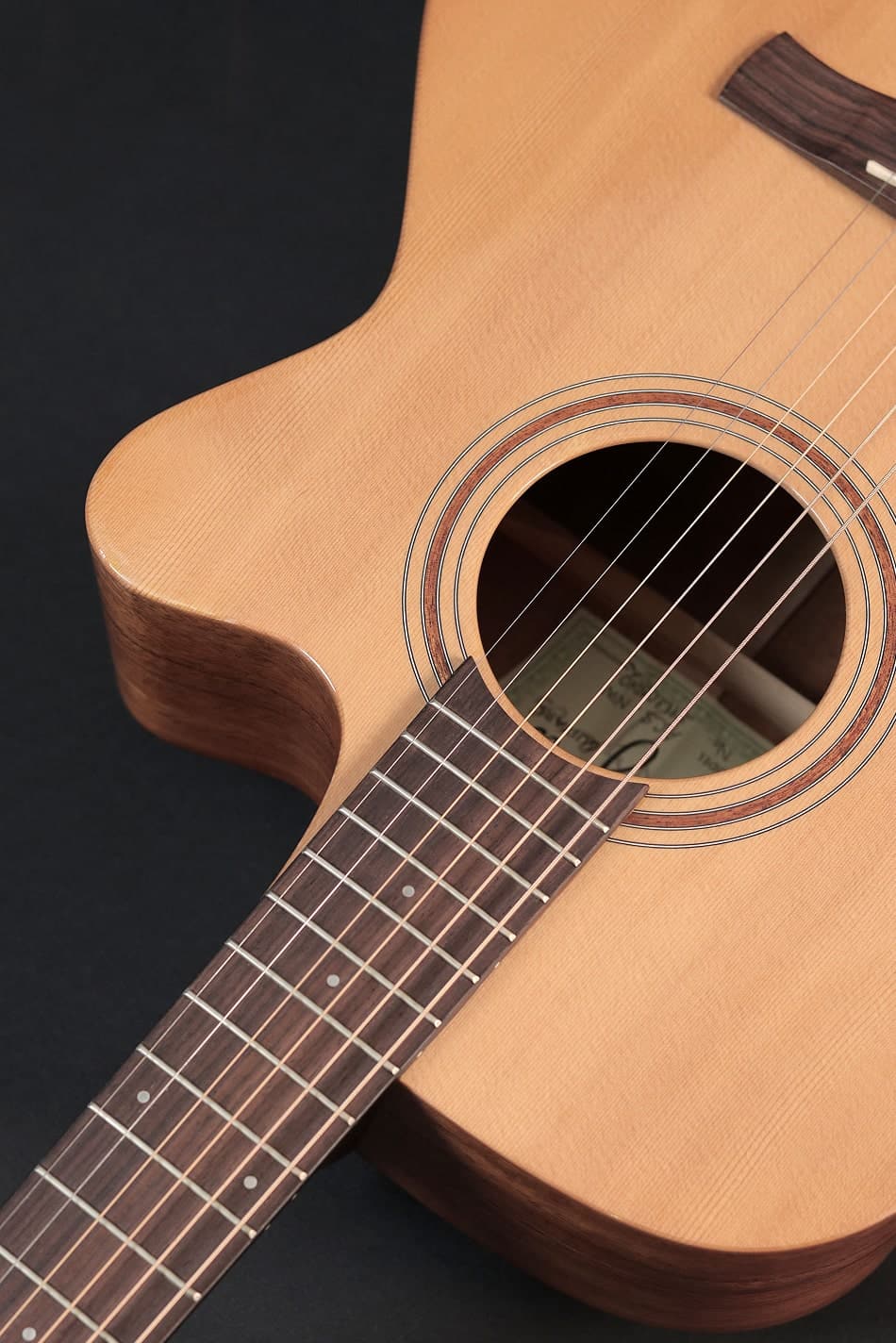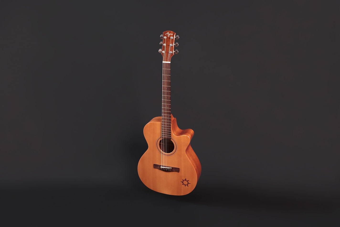 採用西提卡雲杉面板與越南桃花心木側背板,搭配奧昇弦釘,面板鑲嵌木雕小太陽圖騰,溫暖光輝自木紋間綻放,明亮而生動。 音色如暖陽映照大地,低頻穩健、中頻溫暖、高頻透亮,層次分明且充滿朝氣。