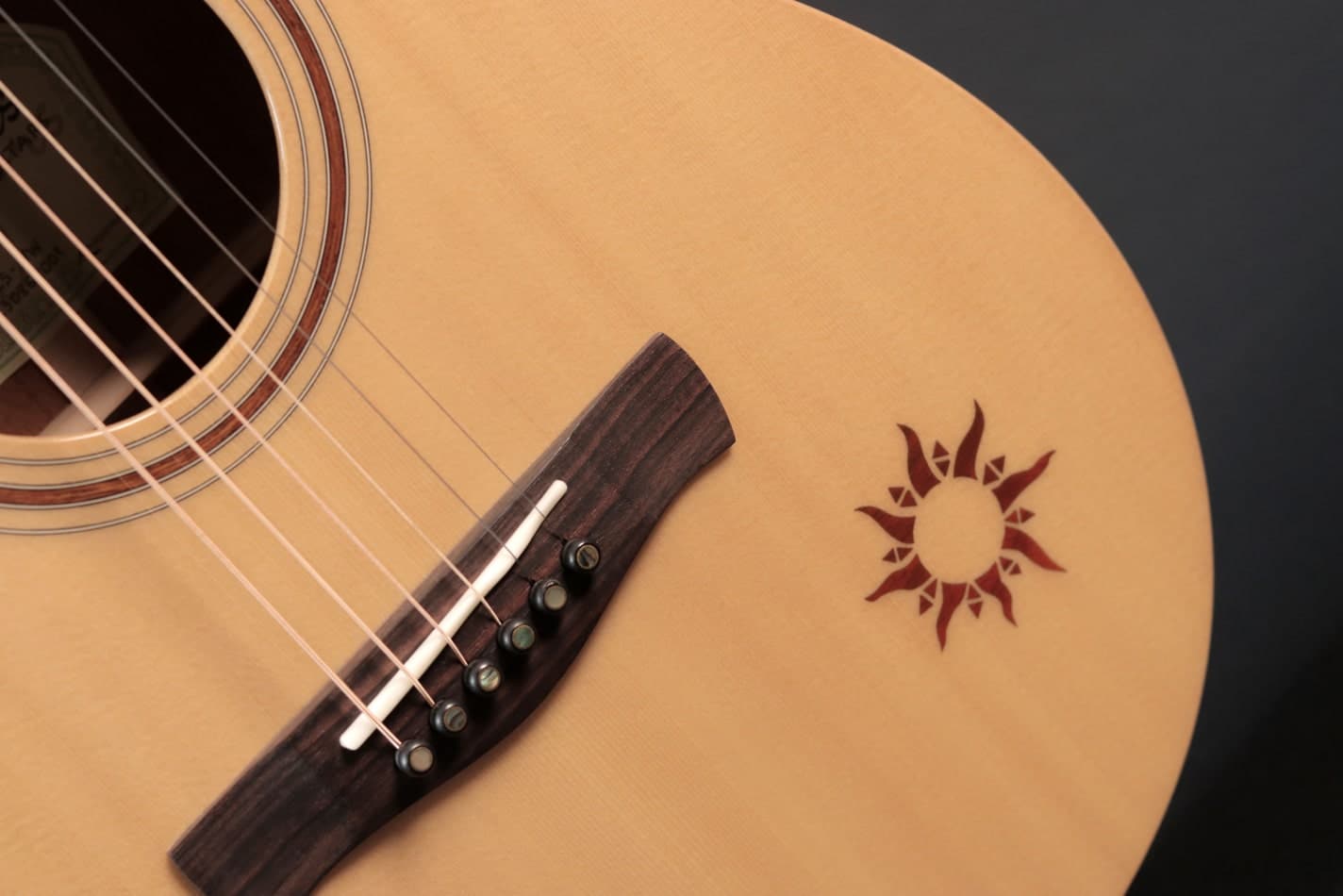 採用西提卡雲杉面板與越南桃花心木側背板,搭配奧昇弦釘,面板鑲嵌木雕小太陽圖騰,在小巧琴身上依舊綻放溫暖光輝,明亮而生動。音孔維持標準尺寸,便於安裝拾音器,讓旅行琴兼具舞台演奏的可能。 音色如暖陽映照大地,清透靈動,中頻溫暖飽滿,高頻輕盈明亮,層次分明且充滿朝氣。