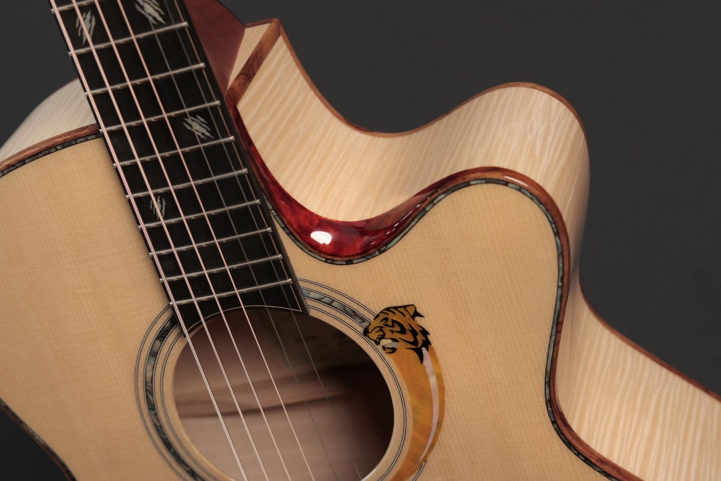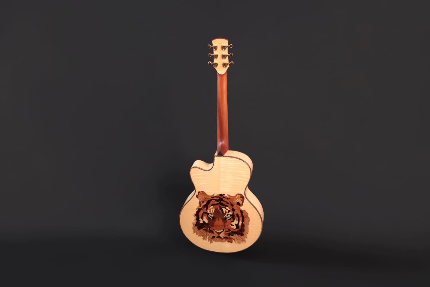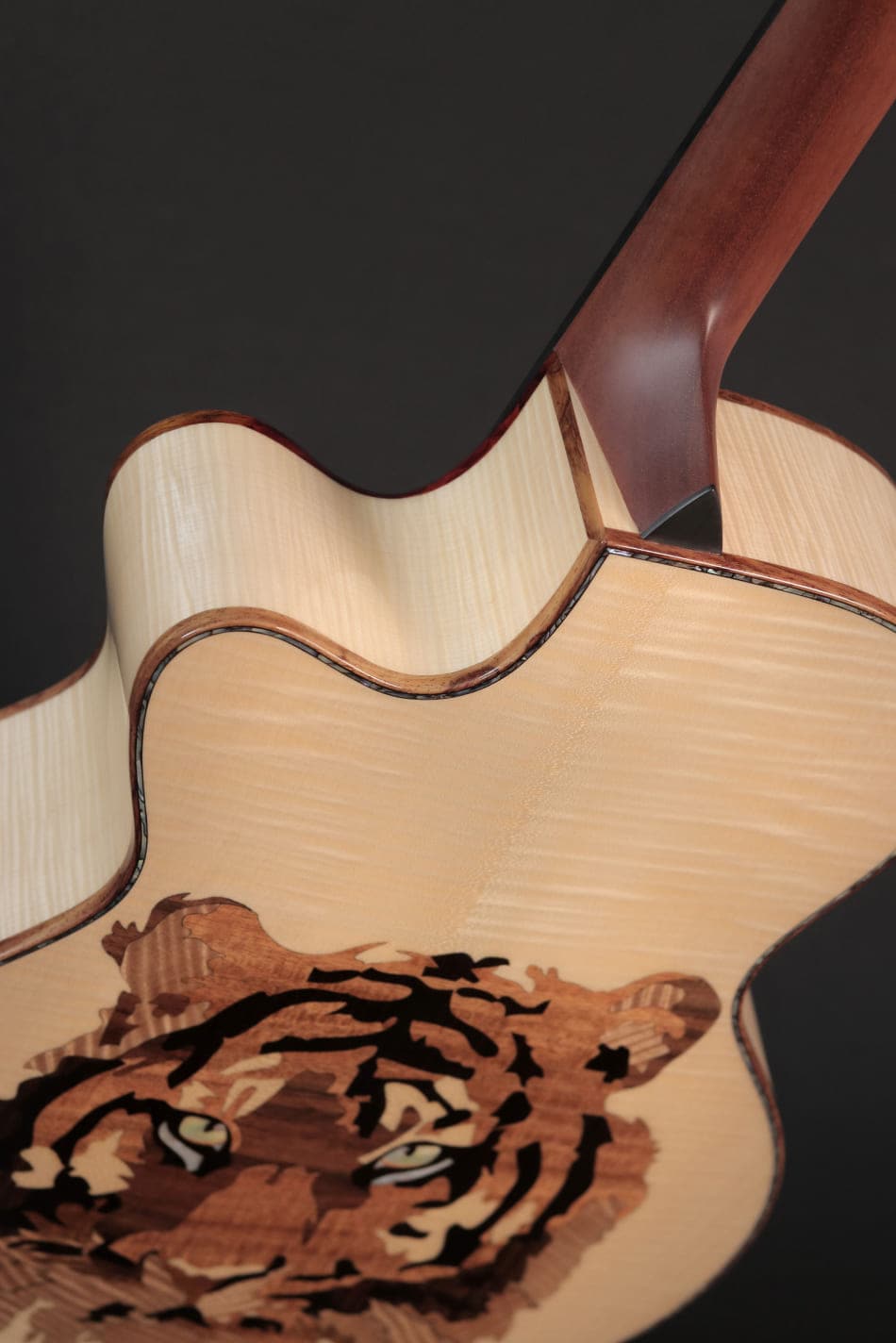 採用英格曼雲杉面板與德國楓木側背板,搭配花梨木靠手,琴頭以虎爪形狀勾勒出銳利虎眼,背板鑲嵌威嚴虎首,口輪圈點綴虎牙圖騰,整體設計如猛虎潛伏,蓄勢待發。 音色剛勁明亮,德國楓木帶來清晰穿透力與靈敏動態,雲杉則增添溫暖泛音,層次鮮明,音色乾淨俐落,如猛虎低吟,張力十足。