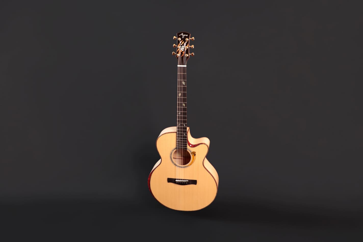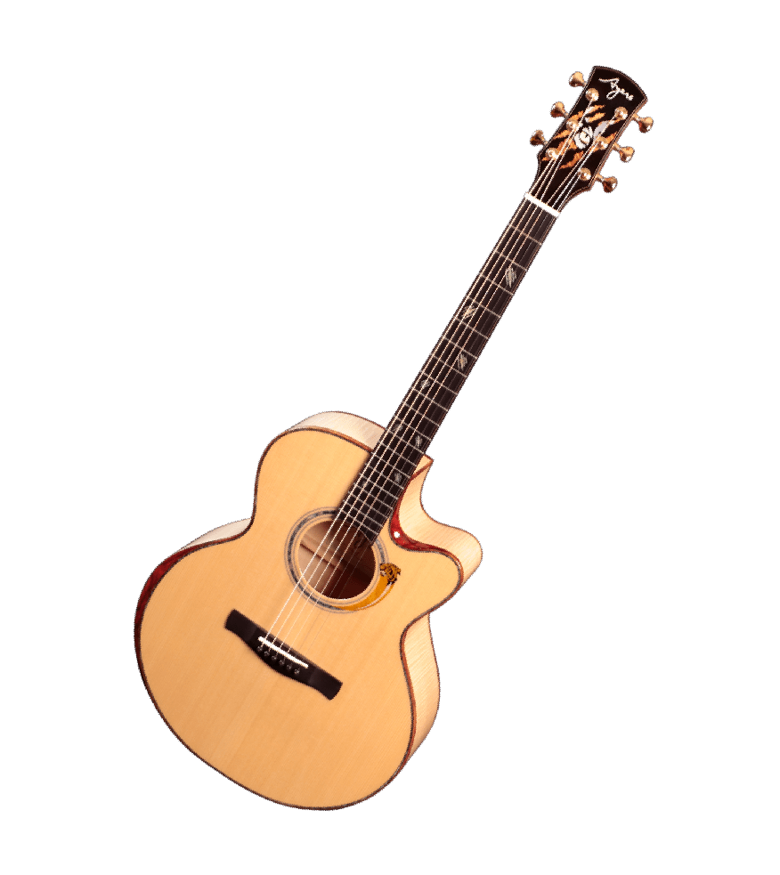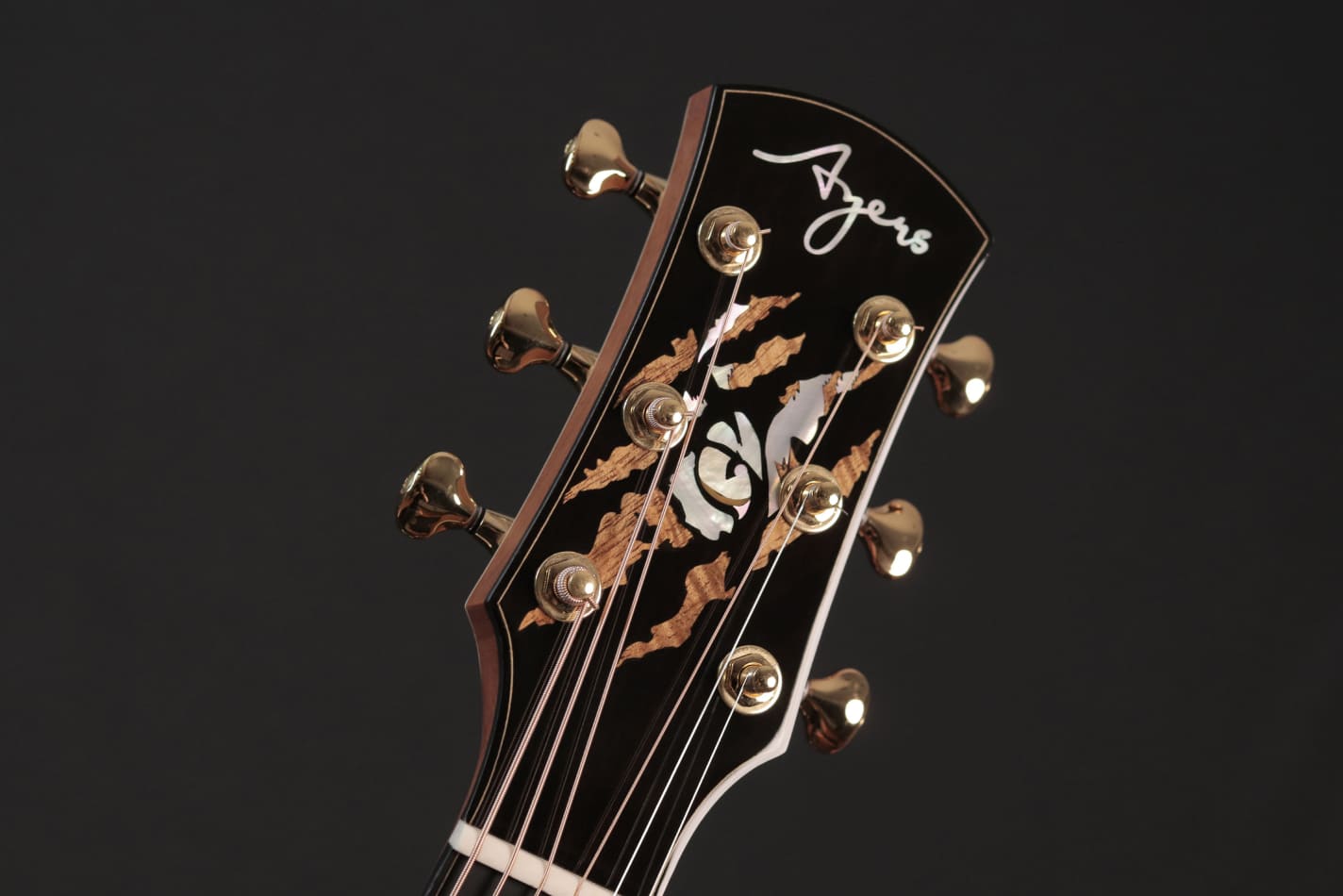 採用英格曼雲杉面板與德國楓木側背板,搭配花梨木靠手,琴頭以虎爪形狀勾勒出銳利虎眼,背板鑲嵌威嚴虎首,口輪圈點綴虎牙圖騰,整體設計如猛虎潛伏,蓄勢待發。 音色剛勁明亮,德國楓木帶來清晰穿透力與靈敏動態,雲杉則增添溫暖泛音,層次鮮明,音色乾淨俐落,如猛虎低吟,張力十足。
