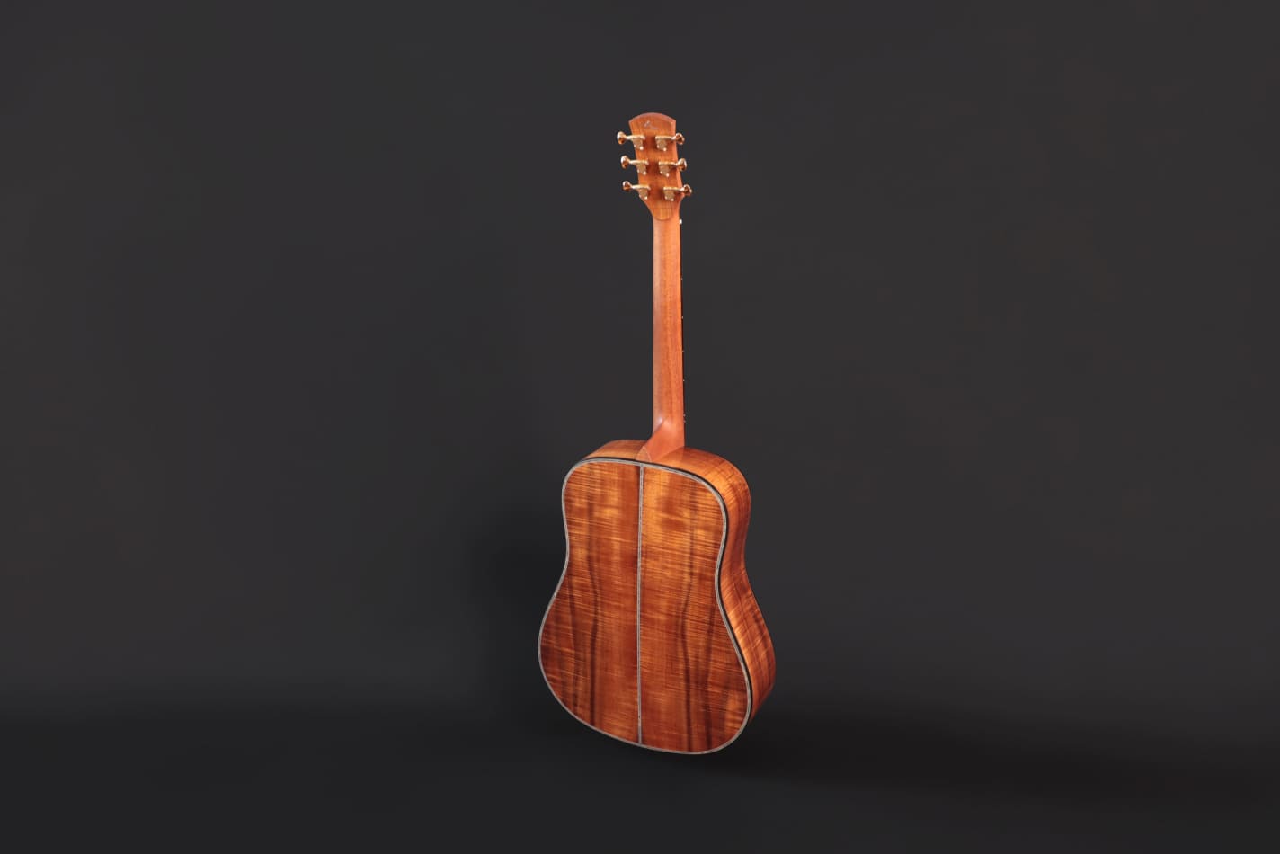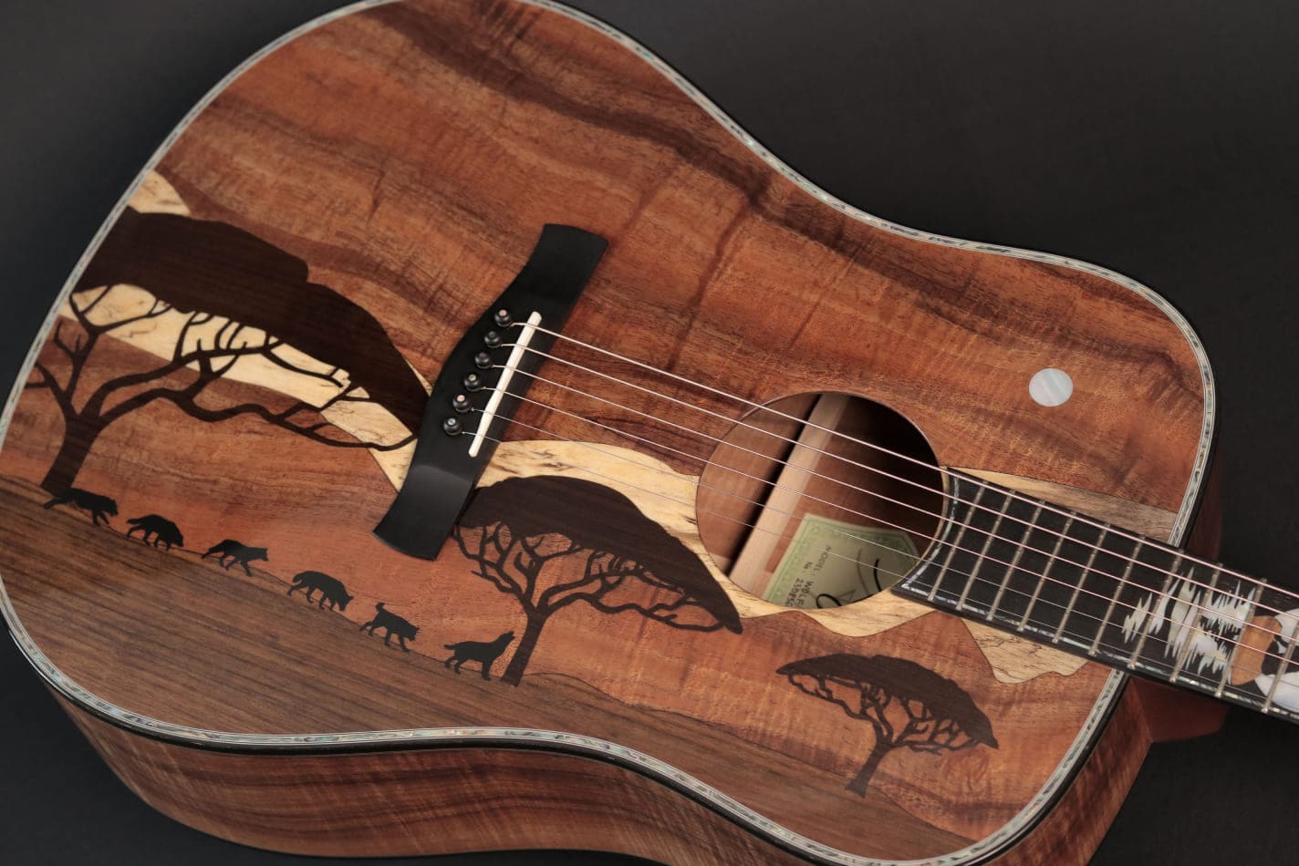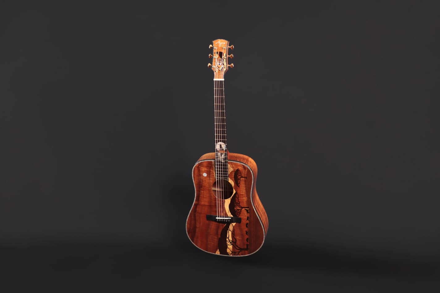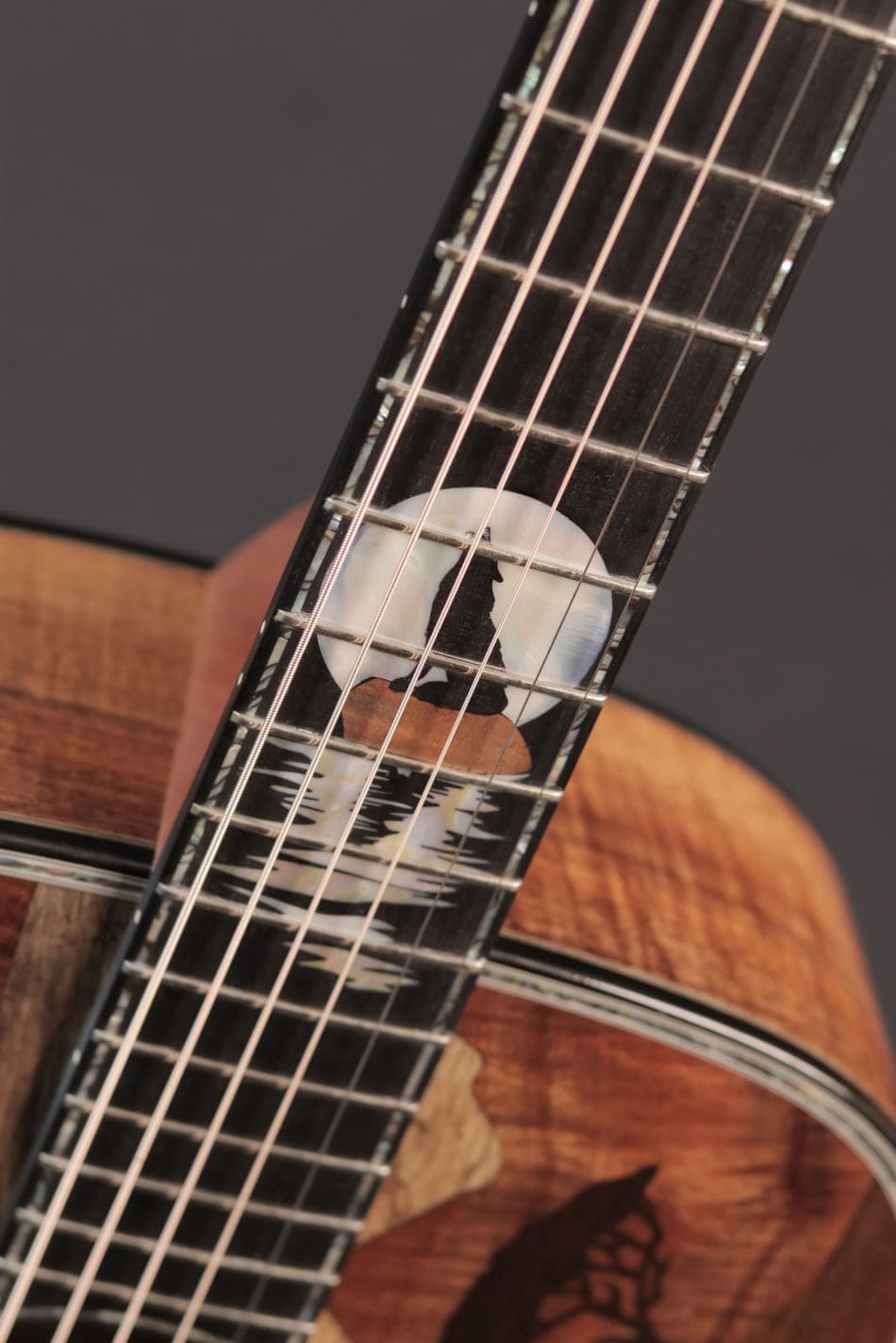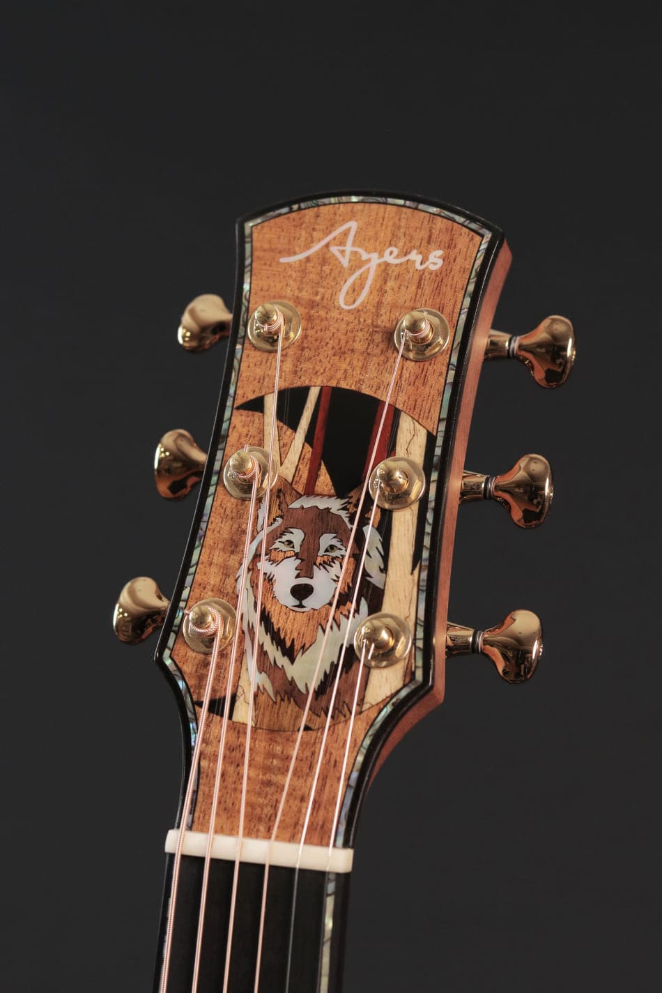 採用 5A 級相思木打造面板與側背板,搭配金色 Gotoh 510 弦鈕,面板鑲嵌狼群於曠野之中,指板點綴狼嚎剪影,琴頭雕刻狼首圖騰,展現野性與力量之美。 音色如群狼奔馳,渾厚飽滿,相思木帶來溫暖共鳴,層次豐富且充滿張力。