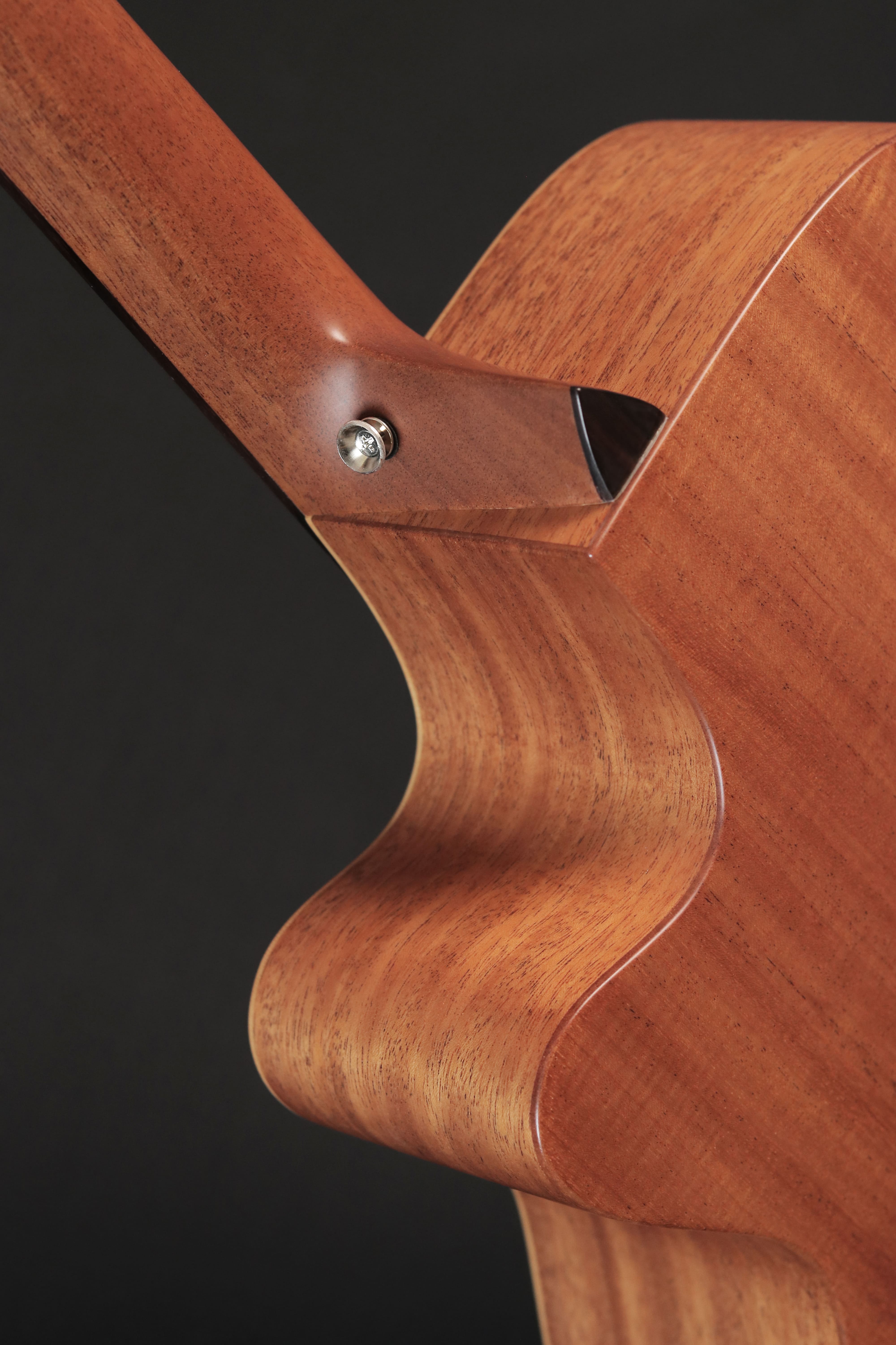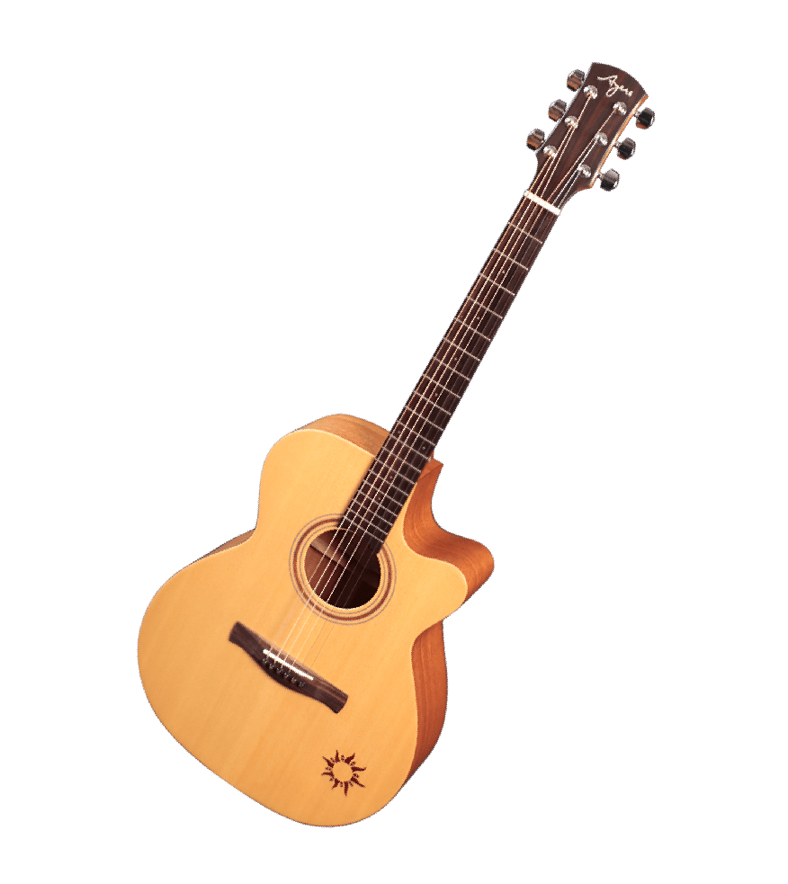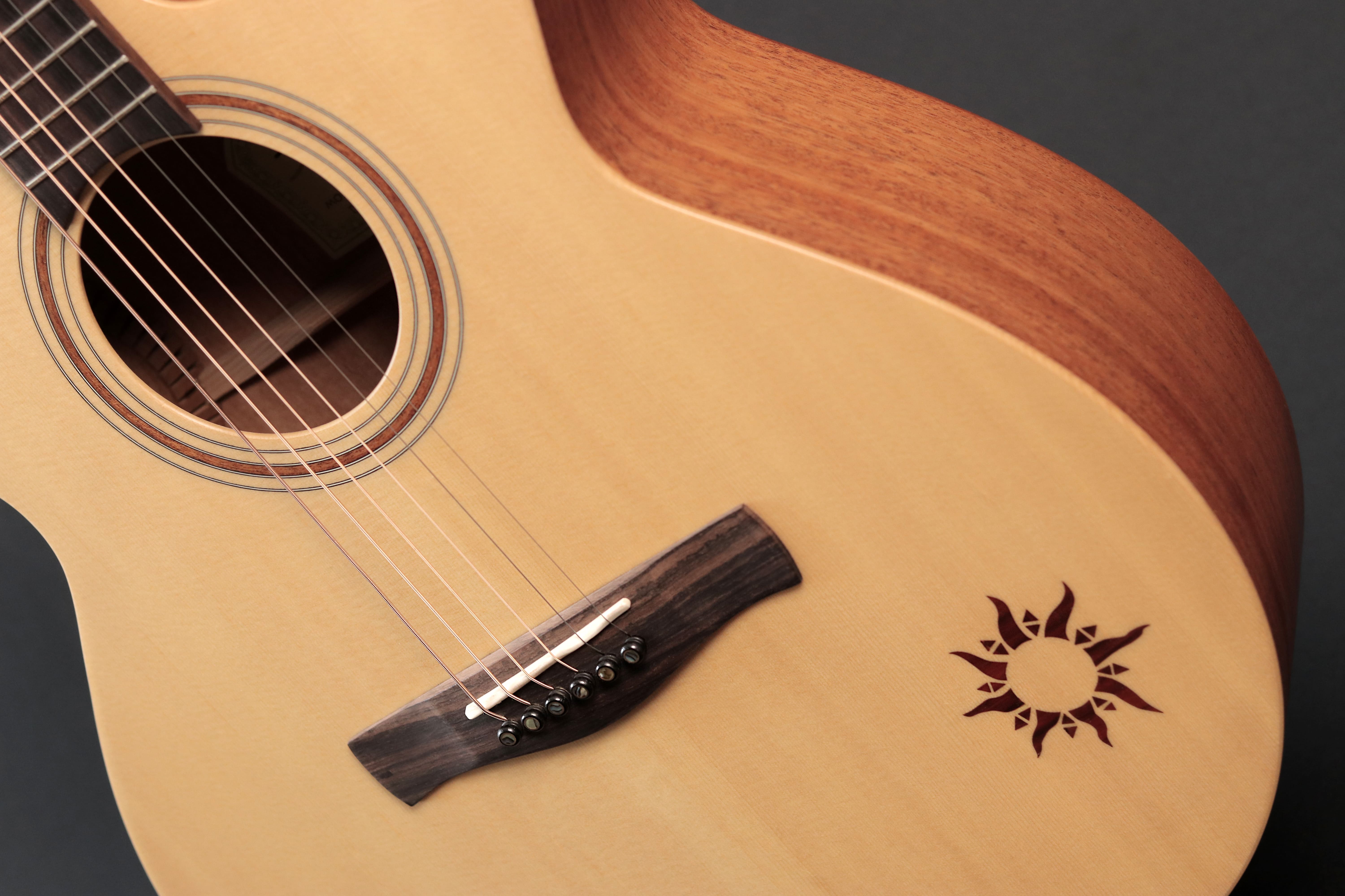 採用西提卡雲杉面板與越南桃花心木側背板,搭配奧昇弦釘,面板鑲嵌木雕小太陽圖騰,溫暖光輝自木紋間綻放,明亮而生動。 音色如暖陽映照大地,低頻穩健、中頻溫暖、高頻透亮,層次分明且充滿朝氣。