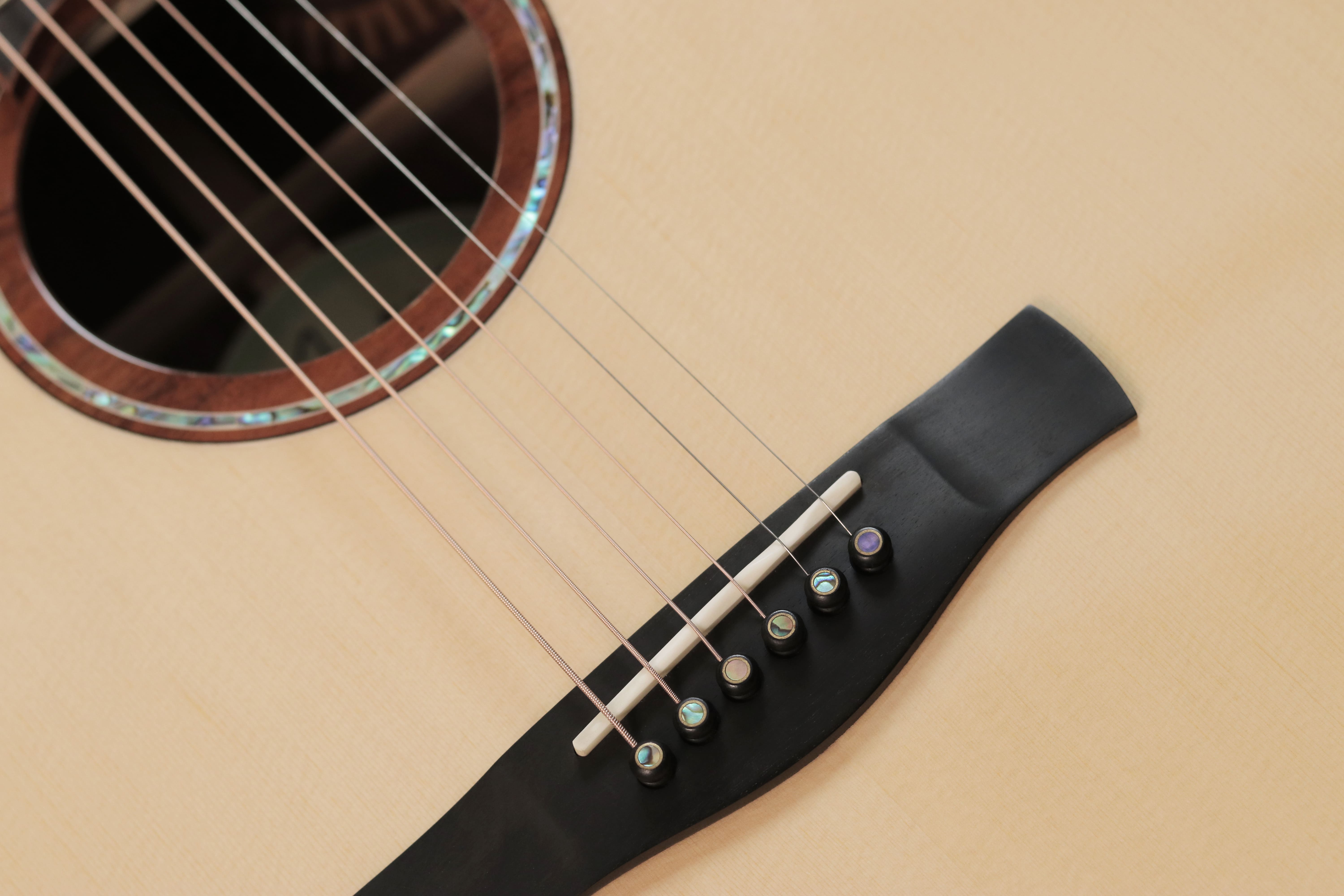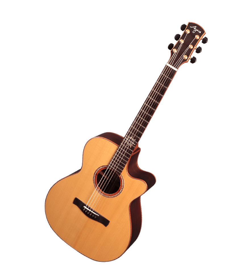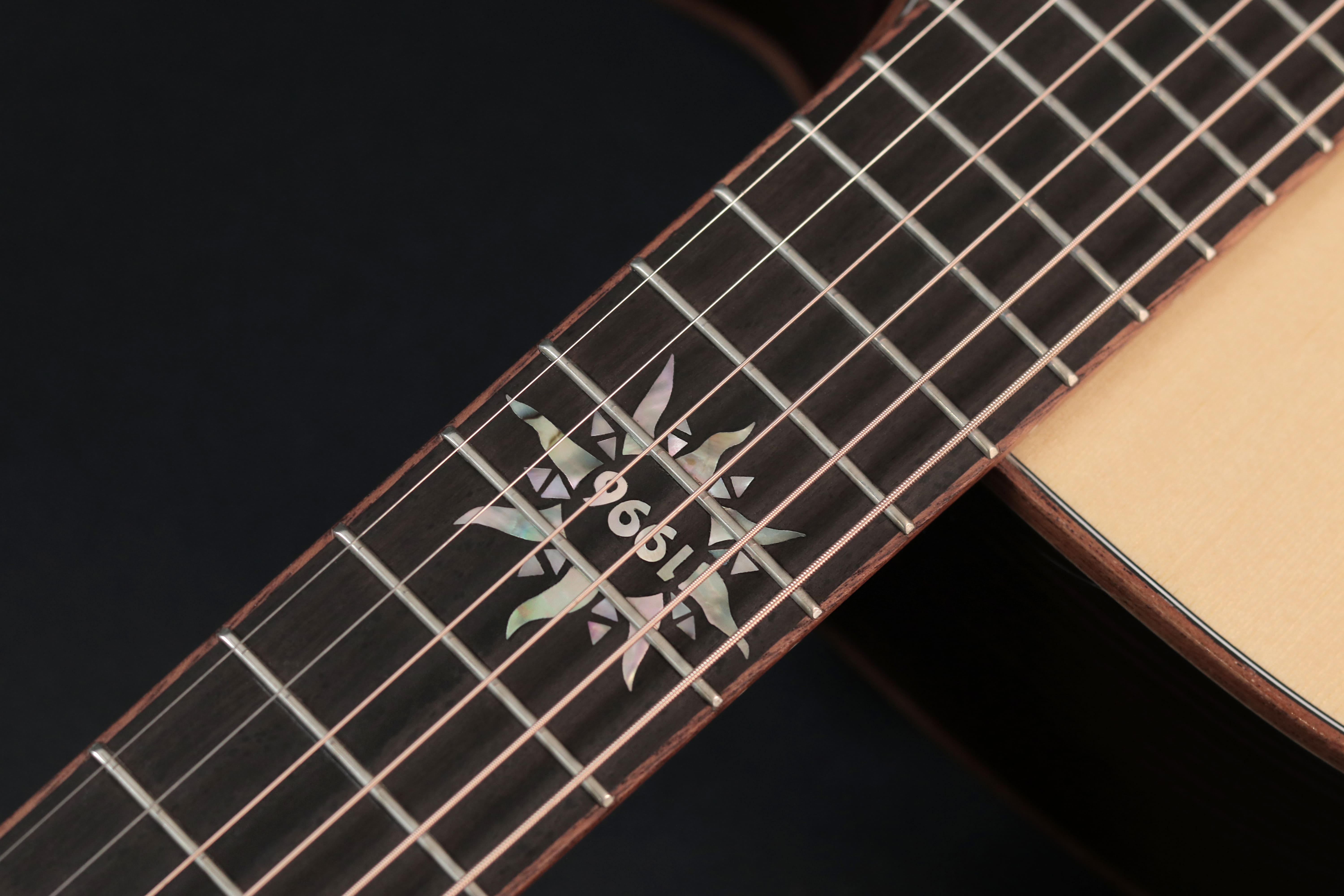 採用英格曼雲杉面板與印度玫瑰木側背板,搭配奧昇弦釘,指板鑲嵌 1996 品牌成立年份與小太陽貝雕。口輪圈以相思木與雲杉交錯,展現溫潤對比之美。 音色深邃飽滿,玫瑰木帶來渾厚低頻與豐富泛音,高頻如小太陽般透亮溫暖。