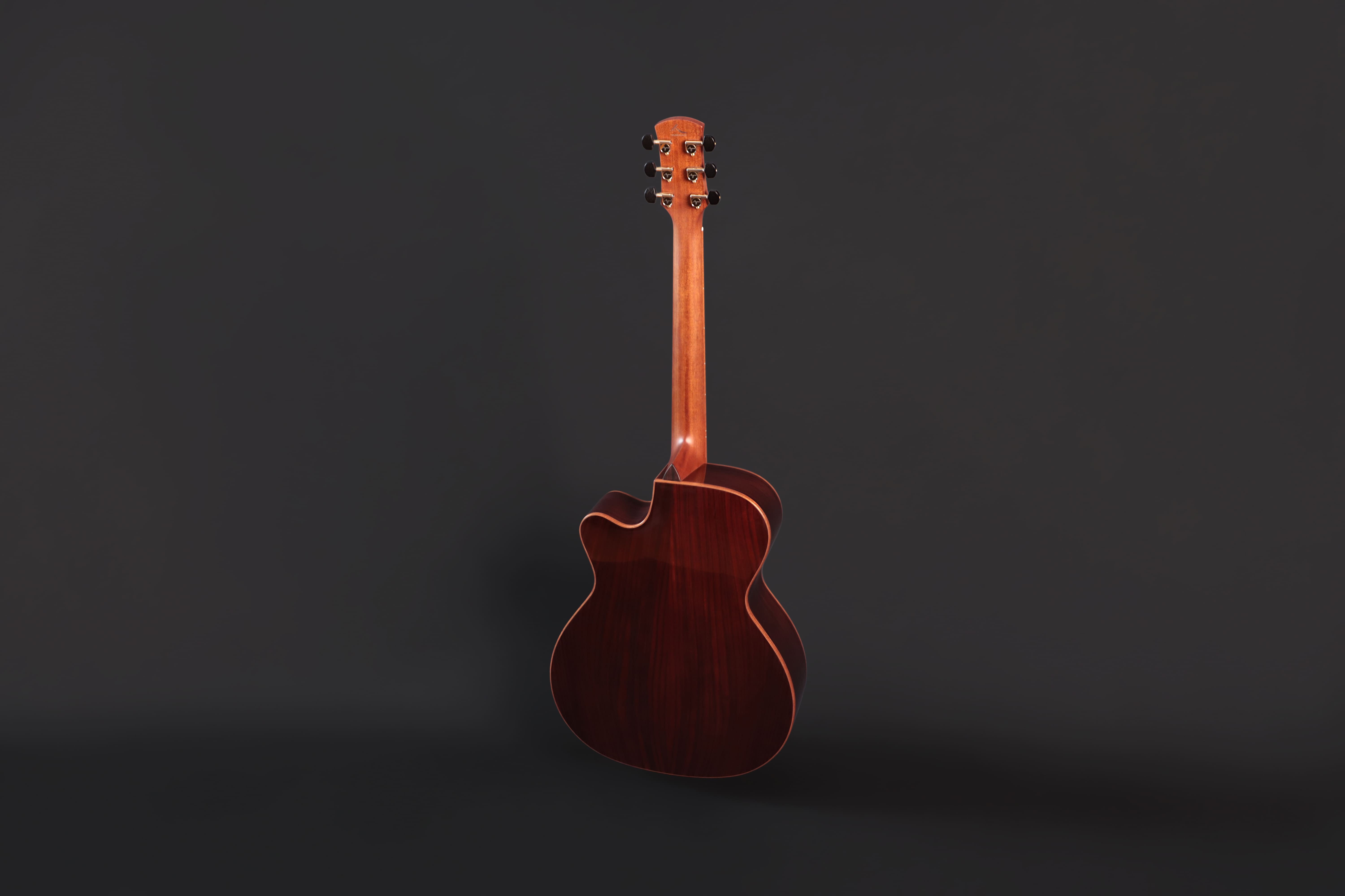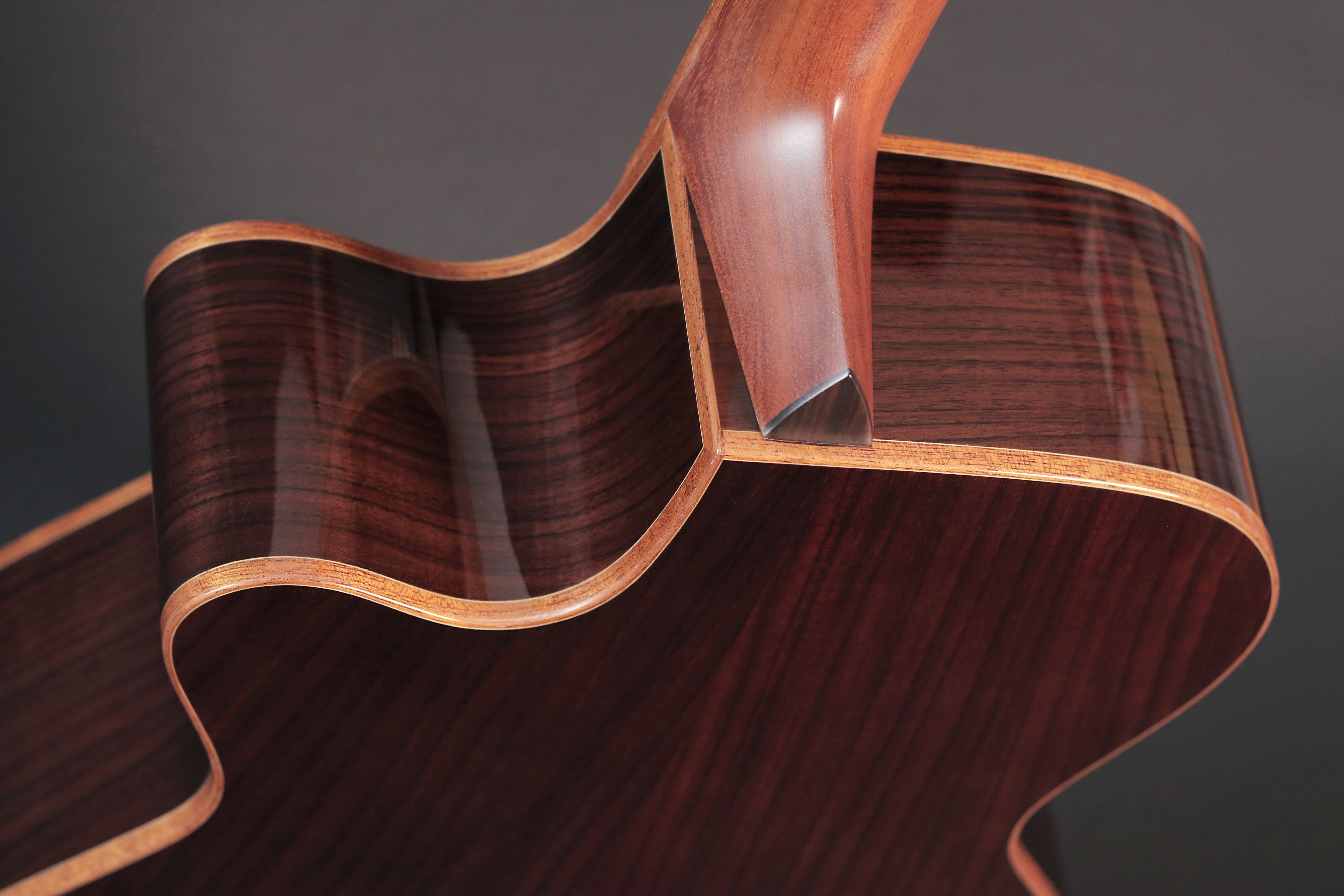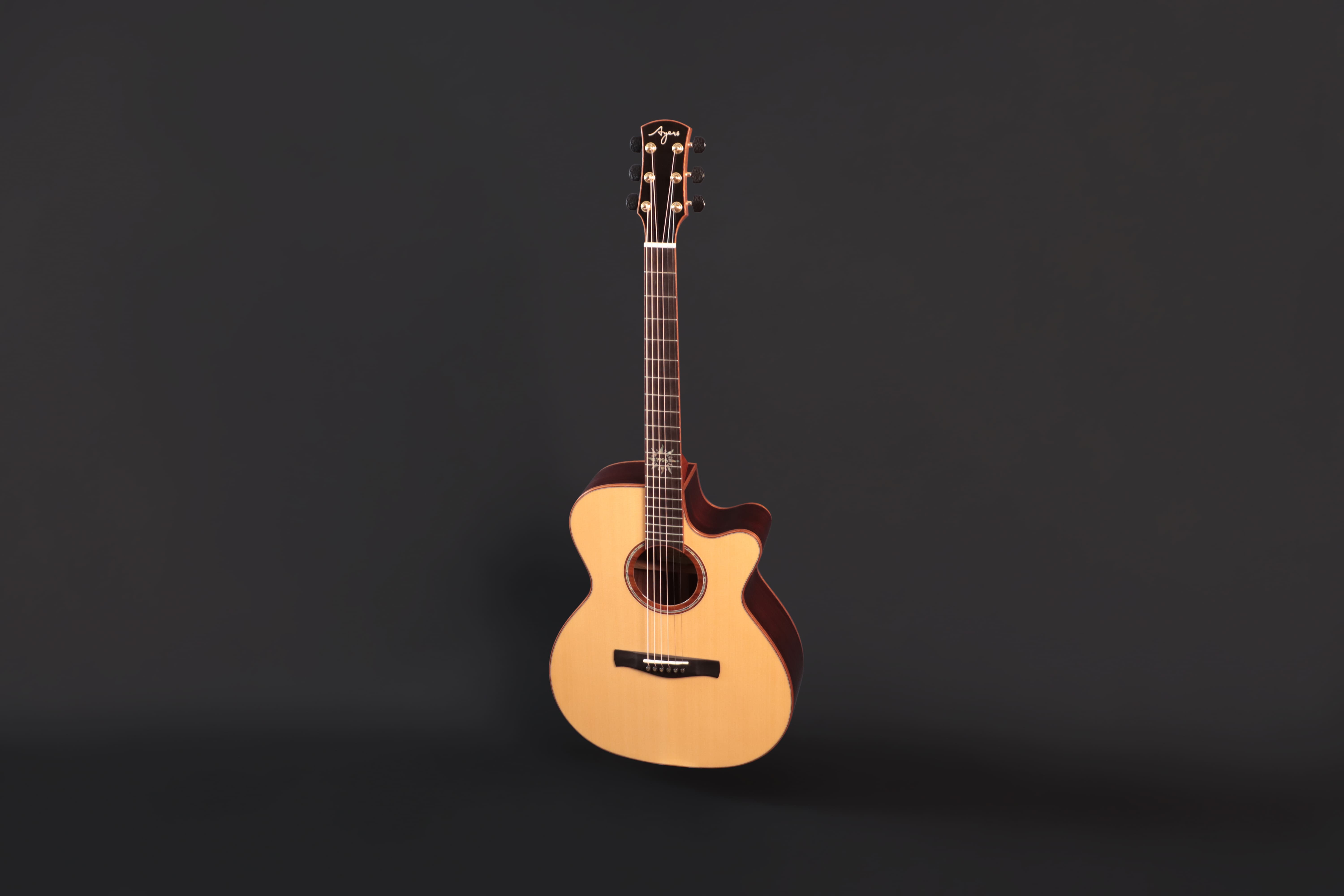 採用英格曼雲杉面板與印度玫瑰木側背板,搭配奧昇弦釘,指板鑲嵌 1996 品牌成立年份與小太陽貝雕。口輪圈以相思木與雲杉交錯,展現溫潤對比之美。 音色深邃飽滿,玫瑰木帶來渾厚低頻與豐富泛音,高頻如小太陽般透亮溫暖。